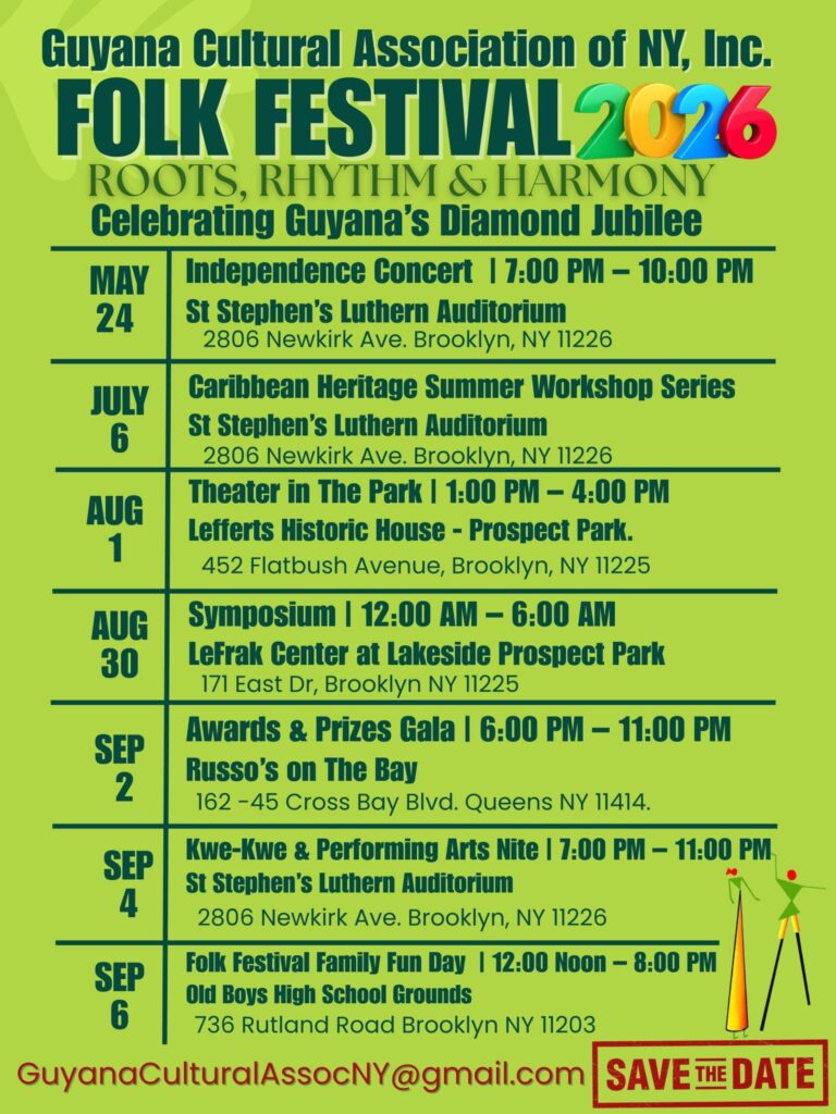 GCA looks forward to welcoming you at our Silver Jubilee Anniversary fund-raising Awards Gala, to be held @ 6:30 p.m. on Wednesday, August 27, 2025, at Russo’s on the Bay 162-05 Cross Bay Blvd Queens NY. The 24th annual Recognitions Ceremony is one the signature events of the annual Guyana Folk Festival season—now in its 25th year, under the theme Guyana’s Cultural Vibes, Vivid and Alive @ 25!